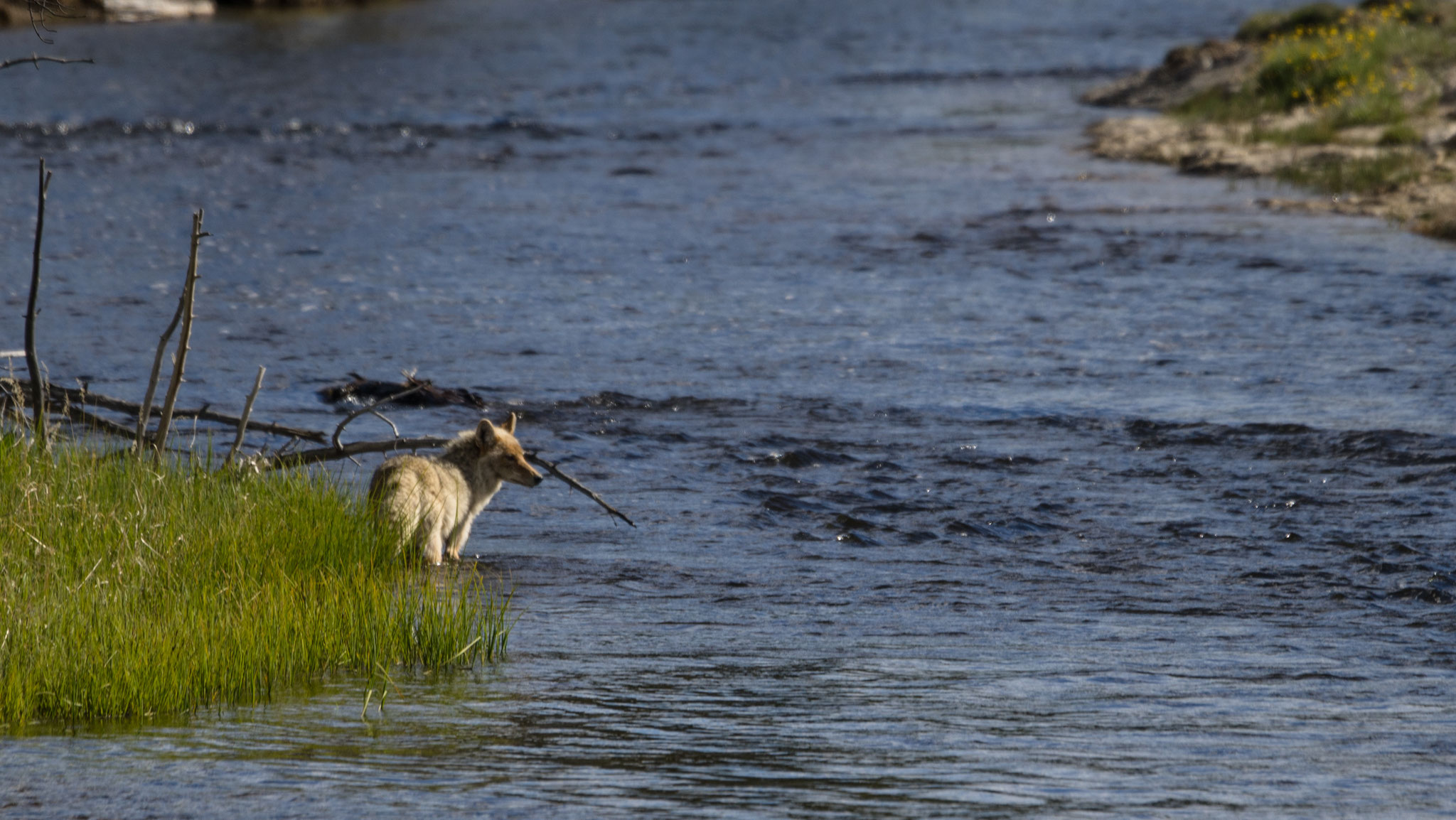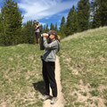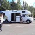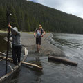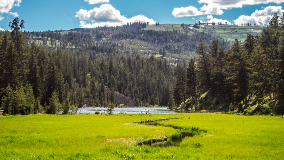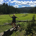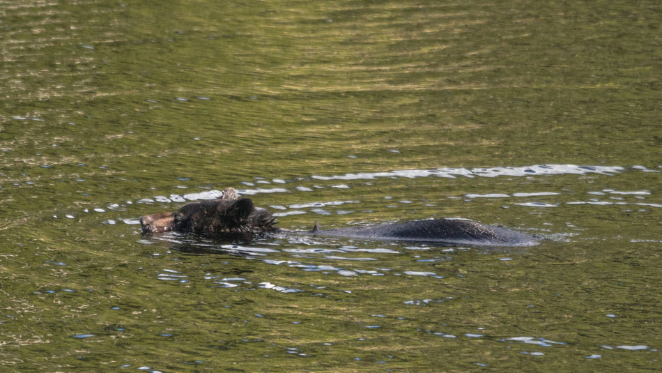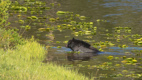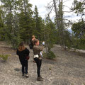Im Gegensatz zum versteinerten Baum raubte diese Gegen uns den Atem. Dunkelgrüne Tannen, lichtgrüne Felder und ein himmelblau spiegelnder See liess uns staunen. HR liess sich nicht losreissen und so blieben wir auf dem Weg bis der uns an eine Kreuzung führte, an dieser wir uns fürs umdrehen entschieden. Auf dem Rückweg wurde die Umgebung nicht langweiliger, besonders als HR nach dem Feldstecher griff und sein Blick über den See schweifen liess und einen Grizzlybär sichtete, in der Mitte des kleinen Bergsees. Der Schock kam schnell, und liess nichts als pures Adrenalin zurück. All diese Artikel und Verhaltensregeln wurden vergessen. Beweis für dummes Verhalten war Elin. Die wusste nichts besseres als sich hinter den erstbesten Busch zu bücken und nicht zu rühren. Wobei die erste Regel war; Sich sichtbar für den Bären zu bewegen. Trotz dieser klein Mädchen Aktion konnte Raffi Fotos schiessen, bis der Bär sich entschied sich 70Meter weiter vorne aus dem Wasser und auf unseren Weg zu gehen. Da wurde schnell aufgeräumt und langsam zurückgelaufen.
